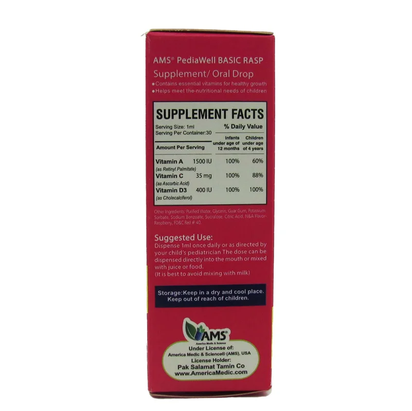 قطره خوراکی پدیاول بیسیک ای ام اس، تحت لیسانس کمپانی AMS آمریکا تولید میشود و حاوی ترکیبات مؤثری است که برای سلامت کودکان بسیار اهمیت دارند. این ترکیبات شامل موارد زیر میشود: