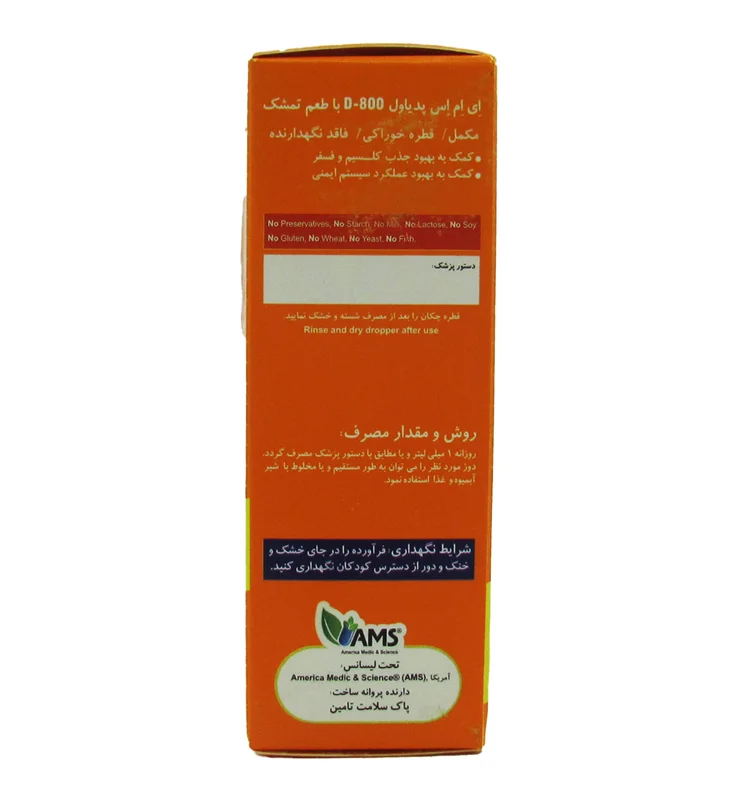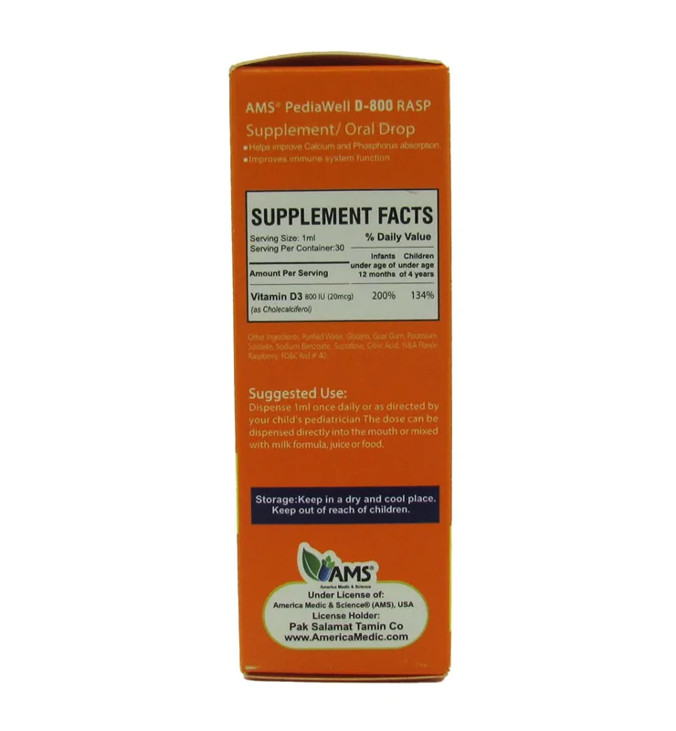 قطره پدیاول د 800 واحد ای ام اس تحت لیسانس آمریکا در بهبود جذب کلسیم و فسفر موثر بوده و باعث افزایش استحکام استخوان و دندان و تقویت سیستم ایمنی میشود. همچنین این محصول، از بیماری نرمی استخوان جلوگیری میکند.