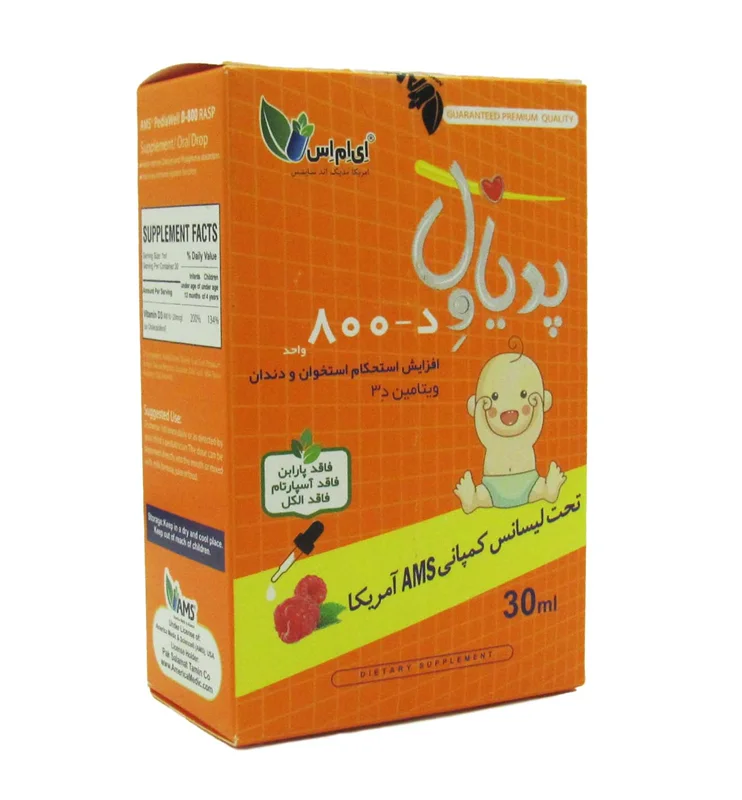 قطره خوراکی پدیاول د ۸۰۰ واحد ای ام اس یک مکمل ویتامینی است که بهبود جذب کلسیم و فسفر، افزایش استحکام استخوان و دندان، تقویت سیستم ایمنی و جلوگیری از بیماری نرمی استخوان را ارائه میدهد. این مکمل، تحت لیسانس کمپانی AMS آمریکا تولید شده و با طعم مطلوب تمشک به بازار عرضه شده است. برای خرید و مشاهده این محصول به داروخانه آنلاین دارووب مراجعه کنید.