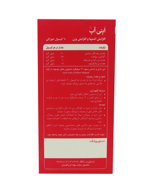 کپسول اپتی آپ شامل ترکیبات موثری است که به عنوان یک راه حل ایمن برای افزایش وزن و اشتها استفاده میشود. این دارو ترکیباتی مناسب داراست که به بدن کمک میکند تا وزن بیشتری بگیرد و اشتهای بیشتری داشته باشد. استفاده از کپسول اپتی آپ میتواند به افراد کمبود وزن یا کماشتها کمک کند تا به صورت سالم و بدون عوارض جانبی وزن خود را افزایش دهند و اشتهای بهتری داشته باشند.