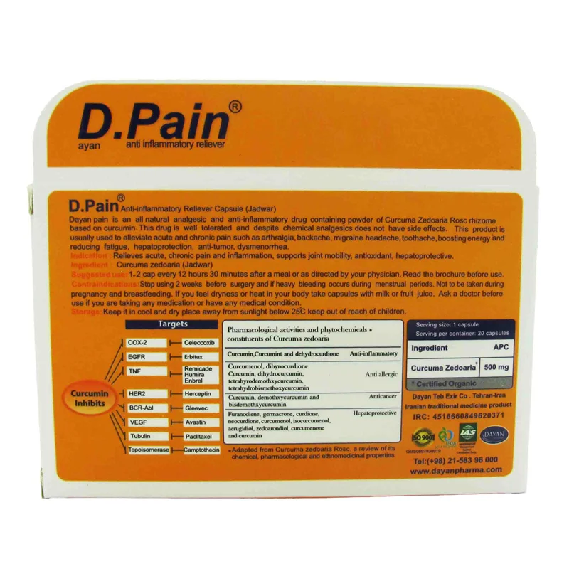 کپسول دایان پین از دایان فارما یک داروی مسکن، ضددرد و ضدالتهاب طبیعی با پودر گیاه کورکومین زدوریا است. این دارو برای تسکین دردهای مفاصل، سردردهای میگرنی، دندان درد، افزایش انرژی و کاهش خستگی، محافظت از کبد و کاهش دردهای دوران قاعدگی مناسب است. از خواص مثبت آن میتوان به خاصیت ضداکسیدانی و آنتیرادیکال اشاره کرد.
