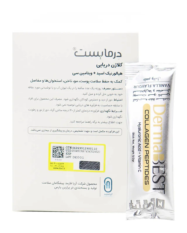 ساشه کلاژن دریایی درمابست نوتری بست، محصولی ساخت ایران است که یک ترکیب منحصر به فرد از کلاژن دریایی هیدرولیز شده، هیالورونیک اسید و ویتامین سی را در خود جای داده است. این مکمل مؤثر در کاهش چین و چروک، جوانسازی پوست، حفظ استحکام ناخن و حفظ سلامت استخوانها و مفاصل میباشد.