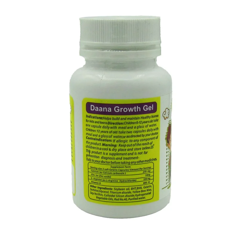 کپسول گروث ژل دانا به عنوان یک منبع تغذیهای کامل و متعادل، به رشد سالم و استقامت استخوانها و دندانها کمک میکند. کلسیم موجود در آن به حفظ قوام استخوانها و دندانها کمک میکند، الآرژنین در تنظیم هورمون رشد و رشد سلامتی بدن ارتباط دارد، روی به تقویت سیستم ایمنی و حفظ سلامت پوست کمک میکند و ویتامین D3 به جذب کلسیم از رودهها و حفظ سلامت قلب و عروق کمک میکند.