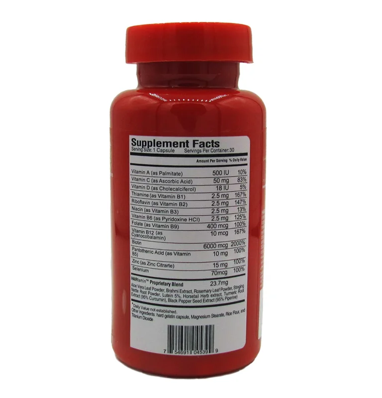 - ویتامین B7 (بیوتین): ویتامین B7 در متابولیسم داخل سلولی نقش داشته و برای عملکرد آنزیمهای بدن بسیار ضروری میباشد. بیوتین در تولید کراتین که یک پروتئین پایه برای بافت پوست و مو میباشد نقش دارد. به دلیل اثرات مفید بیوتین بر رشد مو، به آن ویتامین H نیز گفته میشود. وجود مقادیر بالای بیوتین (6000 میکروگرم) در فرمولاسیون هیرتامین آن را به یک محصول تخصصی برای تقویت رشد مو تبدیل کرده است.