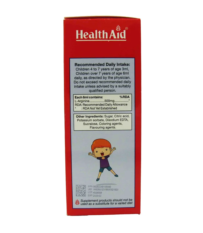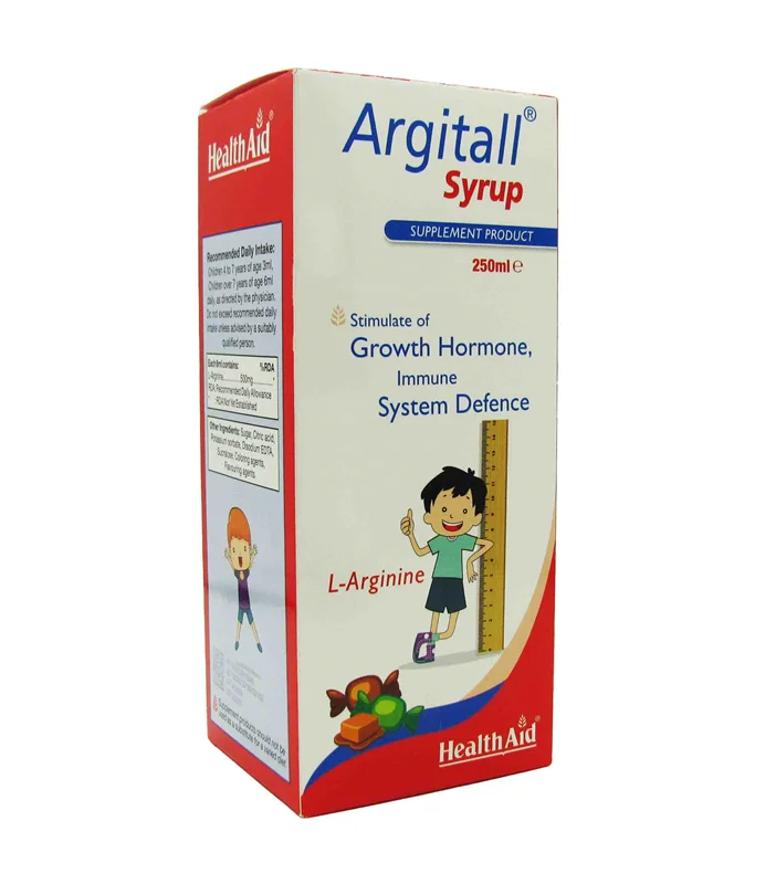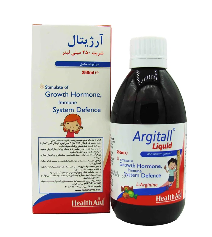 فرمولاسیون شربت آرژیتال هلث اید یکی از مکملهای حاوی ال آرژنین یا همان هورمون رشد است. این ماده اسید آمینهای نیمه ضروری است که برای انجام بسیاری از فرآیندهای مرتبط با فیزیولوژی عضلات ضروری است. از وظایف این ترکیب در بدن میتوان به پاکسازی رادیکالهای آزاد از خون، بهبود عملکرد سیگنالهای سلولهای عضلانی، رهاسازی هورمون رشد، حمایت از کلسترول خوب، تنظیم متابولیسم چربی و سطح نمک در بدن اشاره کرد. این شربت به منظور پشتیبانی ازسلامت و رشد کودکان و افزایش قد آنان مورد استفاده قرار میگیرد. استفاده از این محصول ممکن است به ترشح بهتر هورمون رشد کمک کند که منجر به تقویت رشد و افزایش اندازه استخوان و قد متاثر خواهد شد. همچنین منابع غذایی دیگری که حاوی آرژنین هستند، شامل آجیلهایی مانند بادام زمینی و بادام، همچنین شکلات و کشمش میباشند.