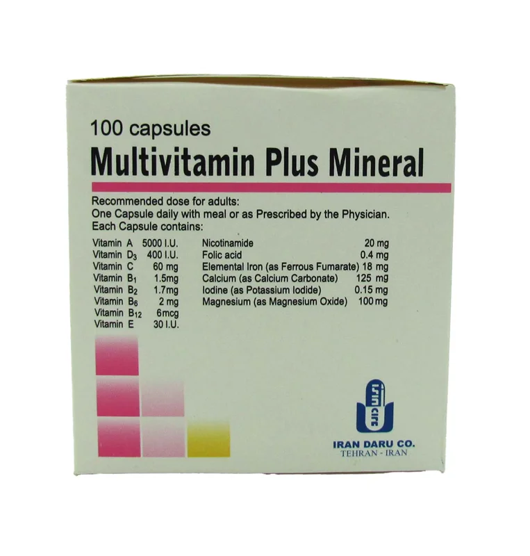 میتوان گفت کپسول مولتی ویتامین مینرال ایران دارو، بهترین مولتی ویتامین ایرانی است که در درمان بیماران مبتلا به کمبود ویتامینها مفید میباشد. خرید مولتی ویتامین در حالاتی که نیاز به مواد غذایی و ویتامینها هست، مانند اعتیاد به الکل، پر کاری تیروئید، آسیب یا بیماری شدید یا در مواردی که جذب، مصرف و دفع ویتامینها غیر طبیعی است، مانند سندرم سوء جذب، بسیار الزامی است و از طرف متخصصان سلامت توصیه میشود. بنابراین مصرف قرص مینرال همچون کپسول مولتی ویتامین مینرال ایران دارو امری ضروری است.
