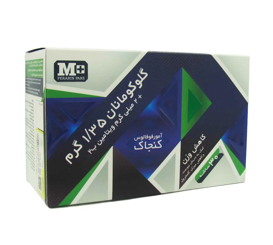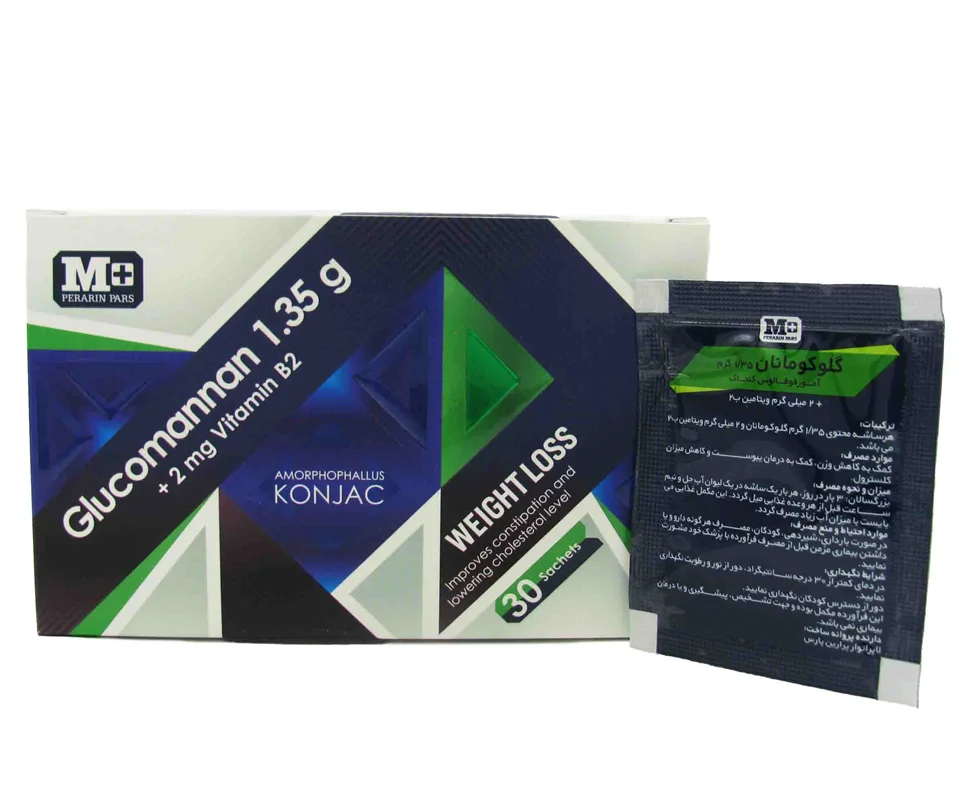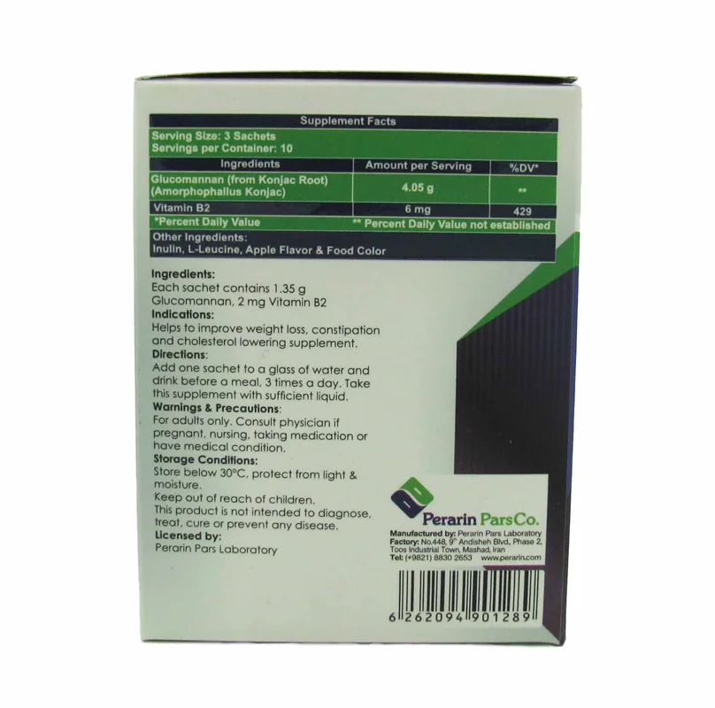 - حاوی ۱,۳۵ گرم گلوکومانان و ۲ میلی گرم ویتامین B2