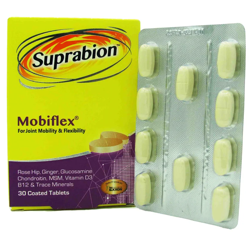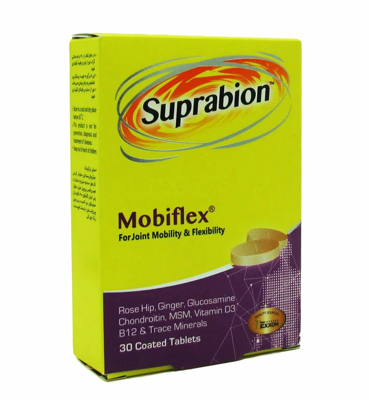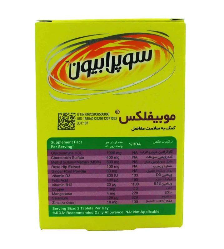 قرص موبیفلکس سوپرابیون با ترکیباتی چون عصاره رز هیپ و پودر ریشه زنجبیل، به عنوان یک مسکن طبیعی با خاصیت ضد التهابی برای دردهای مفصلی شناخته میشود. این محصول شامل کندرایتین، گلوکزامین و متیل سولفونیل متان است که نقش مهمی در ساخت و ترمیم غضروف مفاصل دارند و با تسهیل حرکت مفاصل، جلوگیری از سائیدگی و افزایش انعطافپذیری آنها مواجه میشوند.