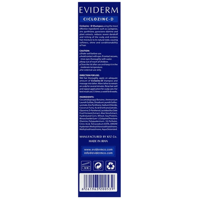 شامپو ضد شوره سیکلوزینک دی اویدرم با ترکیبات قوی مانند سیکلوپیروکس، زینک پیریتیون و پیروکتون اولامین به طور موثر شوره سر را درمان میکند. این شامپو با پاکسازی پوست سر، از بین بردن قارچ عامل شوره و آبرسانی مو، به کاهش خارش، التهاب و پوستهریزی کمک میکند. علاوه بر این، با بهبود سلامت پوست سر، باعث تقویت موها و افزایش درخشندگی آنها میشود. این محصول برای انواع شوره سر، حتی انواع مقاوم، مناسب است و با استفاده منظم، به موهای سالم و زیبا دست خواهید یافت.