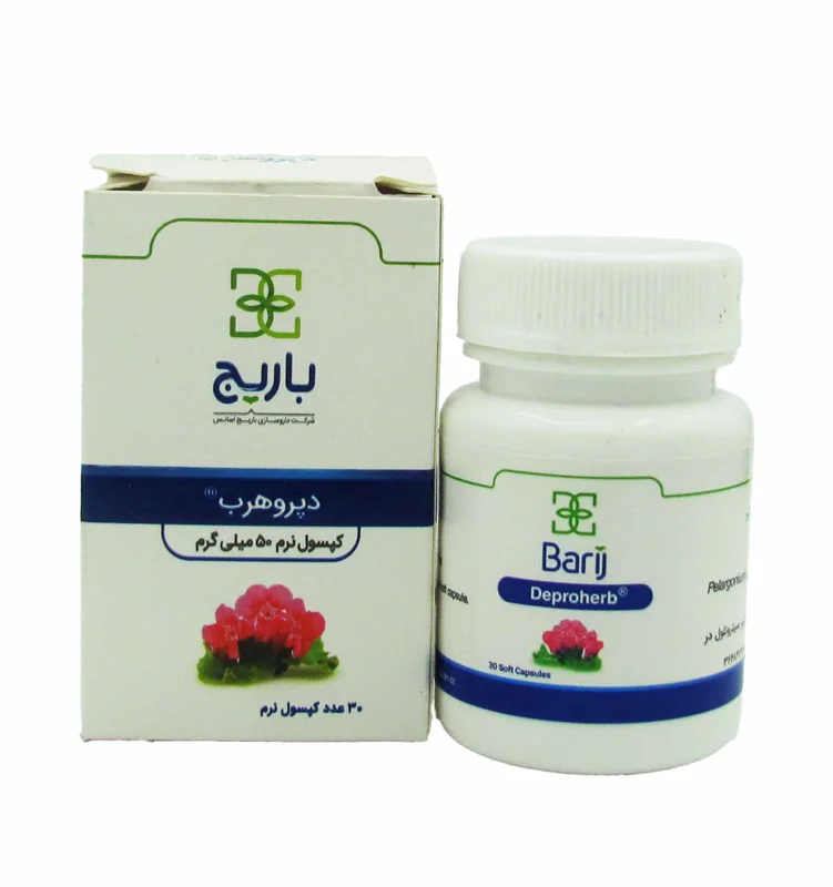 کپسول دپرو هرب باریج اسانس با داشتن اسانس شمعدانی عطری، محصول مناسبی در بهبود افسردگی است.سافت ژل دپروهرب باریج اسانس محصولی مناسب برای بهبود افسردگی است. افسردگی یکی از بیماریهای مزمنی است که می تواند تاثیر منفی بر عملکرد فردی و اجتماعی داشته باشد. در این کپسول دپرو هرب باریج اسانس از عصاره شمعدانی عطری استفاده شده است و همین امر اثربخشی این مکمل را افزایش داده است. این محصول با بهبود بیماری افسردگی نقش موثری در افزایش کیفیت زندگی دارد.کپسول دپرو هرب باریج اسانس با کاهش علائم افسردگی در مرحله اول احساساتی که روبه این بیماری می رود را کنترل کرده و باعث درمان بیماری می شود. علت اصلی فواید کپسول دپرو هرب باریج اسانس ترکیب مهم آن است. کپسول دپرو هرب باریج اسانس با داشتن ترکیبی به نام شمعدانی میتواند سبب بهبود علائم افسردگی، استرس و اضطراب شود و از این رو مصرف دپروهرب تحت نظر پزشک برای بیماران مبتلا به افسردگی توصیه میشود.