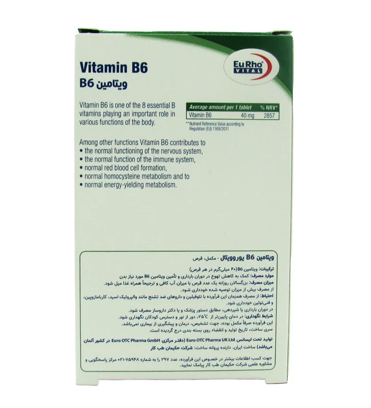 قرص ویتامین B۶ یوروویتال جهت تقویت سیستم عصبی، ساخت گلبولهای قرمز و آزادسازی انرژی مناسب است. در هر قرص حدود ۴۰ میلی گرم ویتامین B۶ وجود دارد که این قرصها به صورت روزانه قابل استفاده هستند.