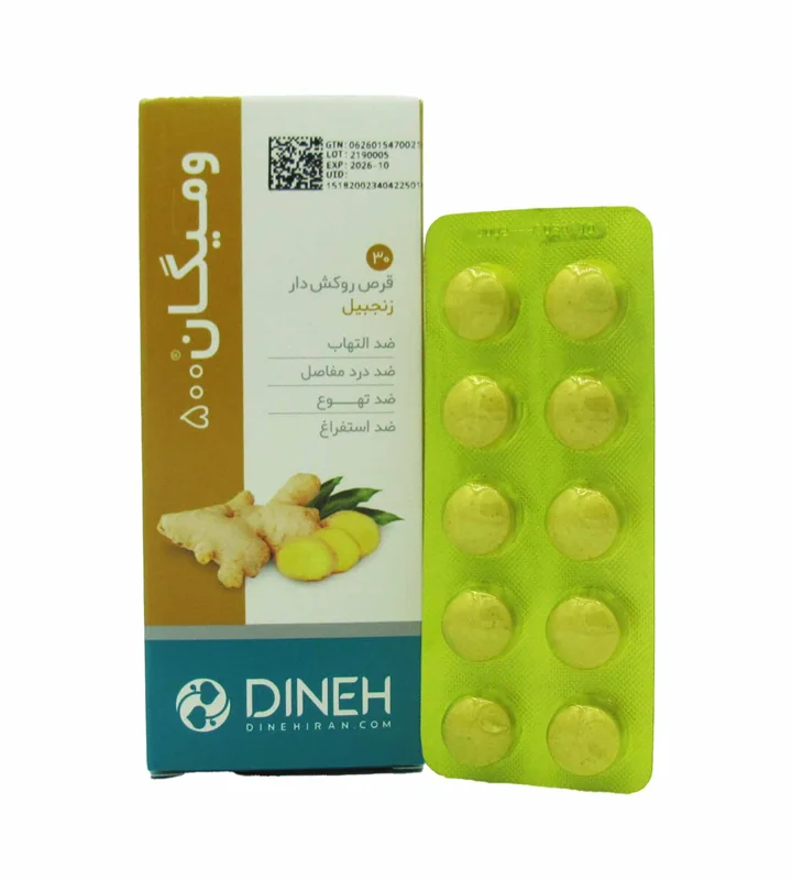 قرص روکش دار گیاهی ومیگان دینه در پیشگیری از تهوع و استفراغ، سرگیجه، بیماری حرکت مورد استفاده قرار میگیرد. قرص روکش دار گیاهی ومیگان دینه یک فرآورده طبیعی حاوی زنجبیل با اثرات ضد تهوع و ضد التهابی برجسته است. اثرات ضد تهوع قرص زنجبیل دینه وابسته به جینجرولها و شوگالهای موجود در ریزوم زنجبیل است.ریزوم زنجبیل به تقویت سیستم ایمنی کمک میکند. زنجبیل به اندازه سیناریزین، دیمن هیدرینات و هیوسین در رفع سرگیجه، استفراغ و تهوع و اسپاسمهای شکمی ناشی از بیماری مسافرت موثر است. این قرص ضد تهوع با دارا بودن ترکیبات فعالی همچون جینجرولها و شوگائولها به کاهش درد و التهاب مفاصل بیماران نیز کمک میکند.زنجبیل به دلیل خواص ضد التهابی آن، در بهبود تورم و دردهای استئوآرتریت (مانند زانو درد) و آرتریت روماتویید بسیار مفید است. همچنین مطالعات قلبی نشان میدهد. قرص زنجبیل ومیگان را برای کاهش تهوع زنان باردار تجویز میشود.