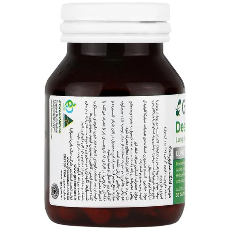 کپسول دیپ لانگ ساپورت گرین نیچر با ترکیبات گیاهی، علاوه بر تسکین سرفه، ریهها را پاکسازی کرده و از آنها در برابر عفونت محافظت میکند.