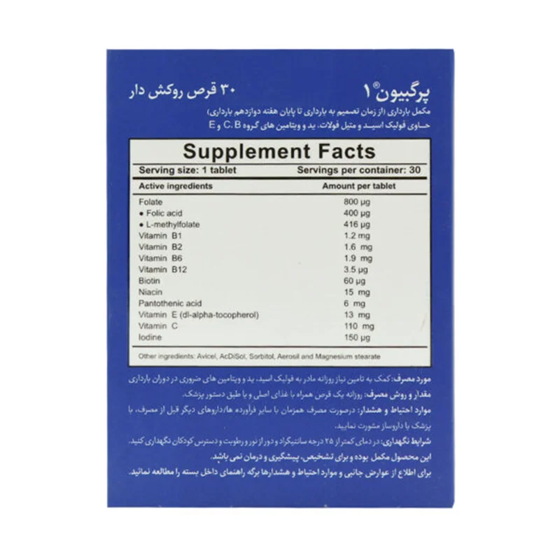 قرص پرگبیون 1 بی اس کی یک مکمل غذایی کامل برای دوران بارداری است که حاوی ویتامینها و مواد معدنی ضروری مانند فولیک اسید، ید و ویتامینهای گروه B، C و E میباشد. این مکمل از زمان تصمیمگیری برای بارداری تا پایان هفته دوازدهم بارداری به حفظ سلامت مادرو رشد مناسب جنین کمک میکند و به ویژه از بروز نقایص مادرزادی مانند نقص لوله عصبی در جنین جلوگیری میکند. پرگبیون 1 با تامین ید مورد نیاز بدن، به تولید هورمونهای تیروئیدی کمک کرده و از بروز مشکلات ناشی از کمبود ید در مادر و جنین پیشگیری میکند. این محصول به صورت قرص روکشدار در بستهبندی ۳۰ عددی توسط شرکت بنیان سلامت کسری تولید میشود.