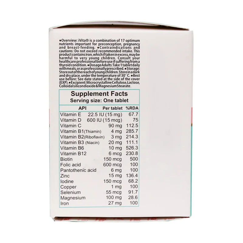 بیوتین: اگرچه کمبود بیوتین در زنان باردار و شیرده به ندرت رخ میدهد، اما به دلیل نقش این ویتامین در رشد جنین، در بسیاری از مکملهای دوران بارداری یافت میشود. با این حال، توصیه نمیشود که از دوزهای بالای بیوتین در دوران بارداری و شیردهی استفاده شود. نیاز به این ویتامین برای زنان باردار و شیرده به ترتیب ۳۰ و ۳۵ میکروگرم است. مقدار بیوتین موجود در قرص آی ویتا برای هر قرص، ۱۵۰ میکروگرم است.