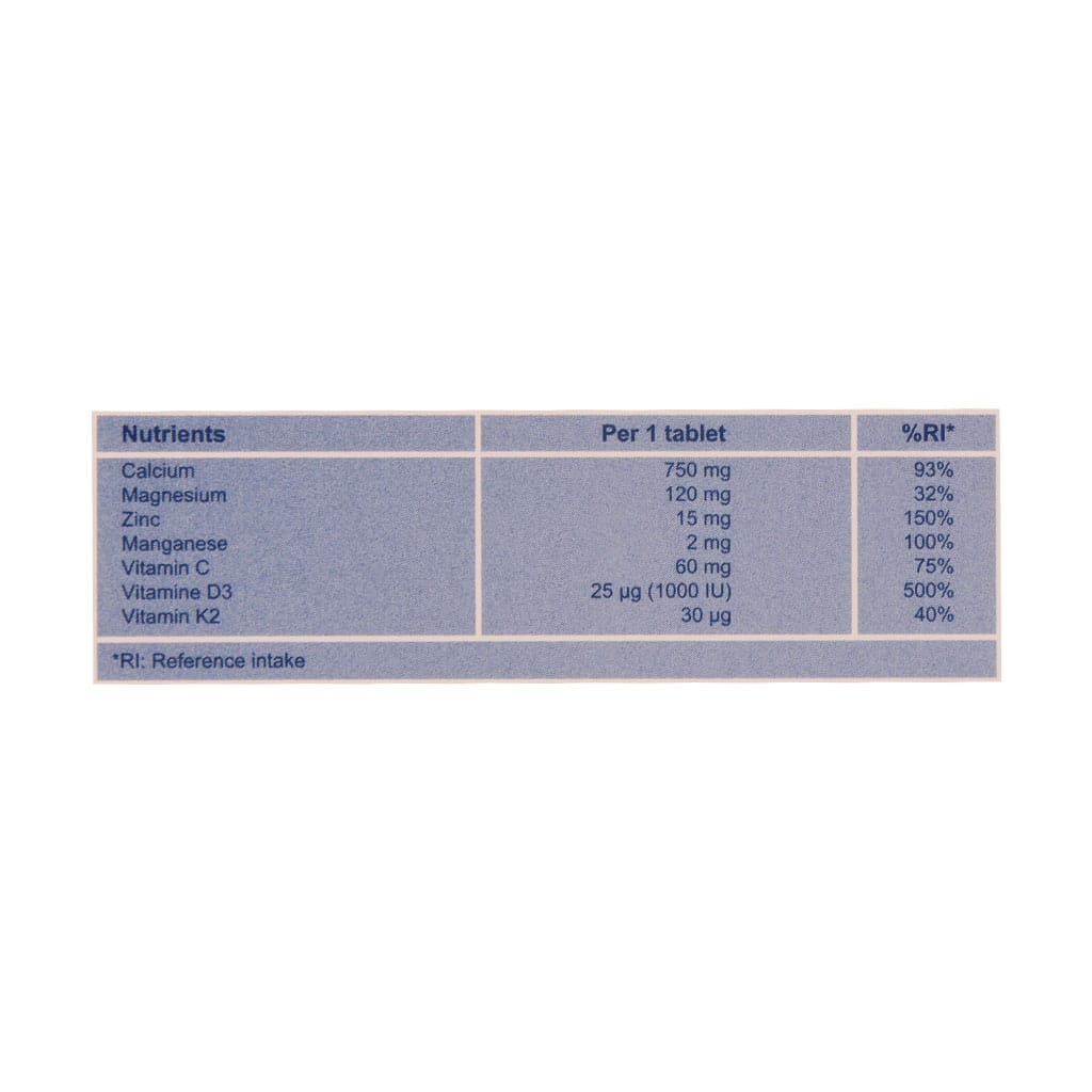 - حاوی ترکیب کامل کلسیم، منیزیم، زینک، منگنز و ویتامینهای C, D3, K2