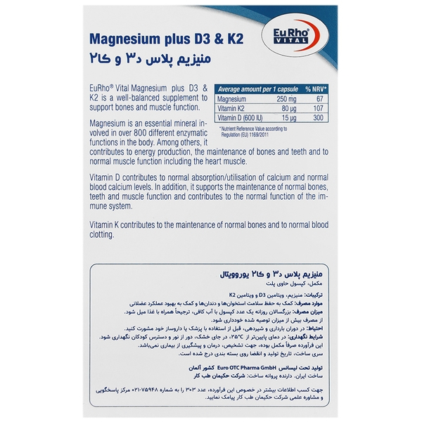 کپسول منیزیم پلاس د3 و کا2 یوروویتال یک مکمل پیشرفته است که با ترکیب هوشمندانه منیزیم، ویتامین D3 و K2، راهکاری جامع برای حفظ سلامت استخوانها و بهبود عملکرد عضلات ارائه میدهد. این محصول با تنظیم هدفمند متابولیسم کلسیم در بدن، نه تنها به افزایش تراکم استخوان کمک میکند، بلکه از رسوب کلسیم در عروق خونی نیز جلوگیری مینماید. مصرف این مکمل برای افرادی که به دنبال تقویت سیستم اسکلتی، کاهش گرفتگیهای عضلانی و پشتیبانی از سلامت قلبی-عروقی هستند، بسیار مناسب است. این فرمولاسیون مؤثر به ویژه برای پیشگیری از پوکی استخوان و حفظ سلامت عمومی بدن طراحی شده است.