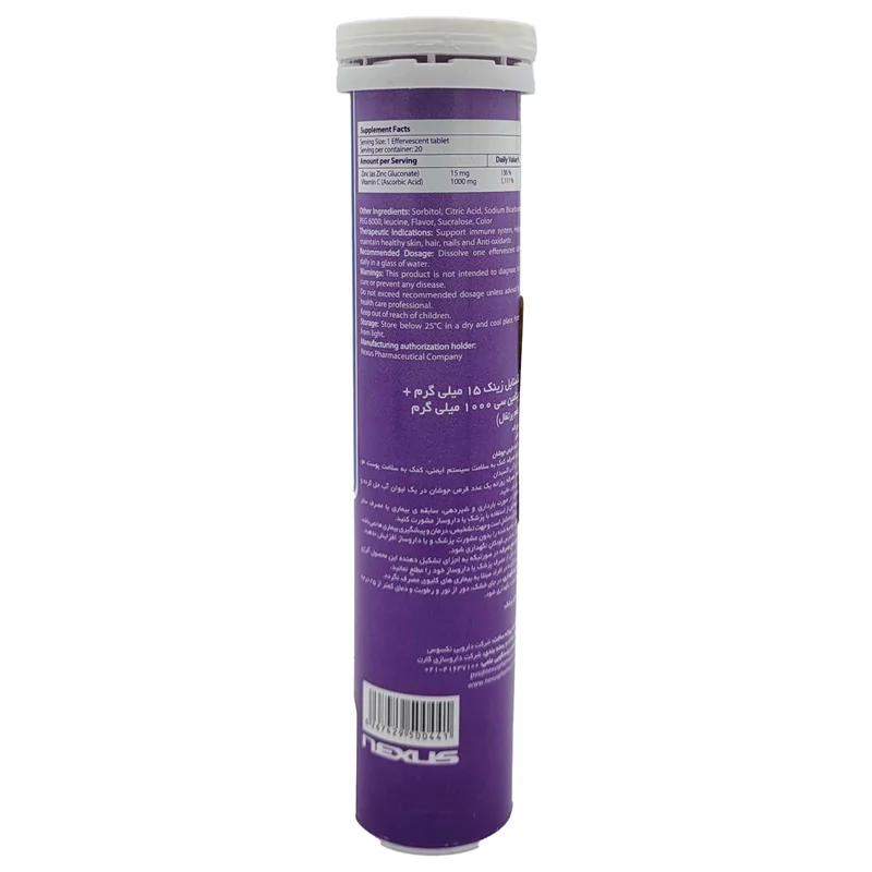 قرص جوشان زینک 15 میلی گرم و ویتامین سی نکستایل حاوی ۱۵ میلیگرم زینک و ویتامین سی نکستایل باخاصیت آنتیاکسیدانی بسیار بالا میتواند آثار مخرب رادیکالهای آزاد بر پوست، مو و ناخن را خنثی نماید. همچنین این مکمل باعث تقویت سیستم ایمنی میشود.
