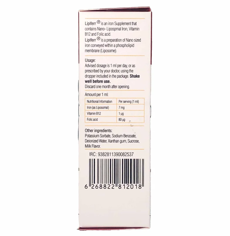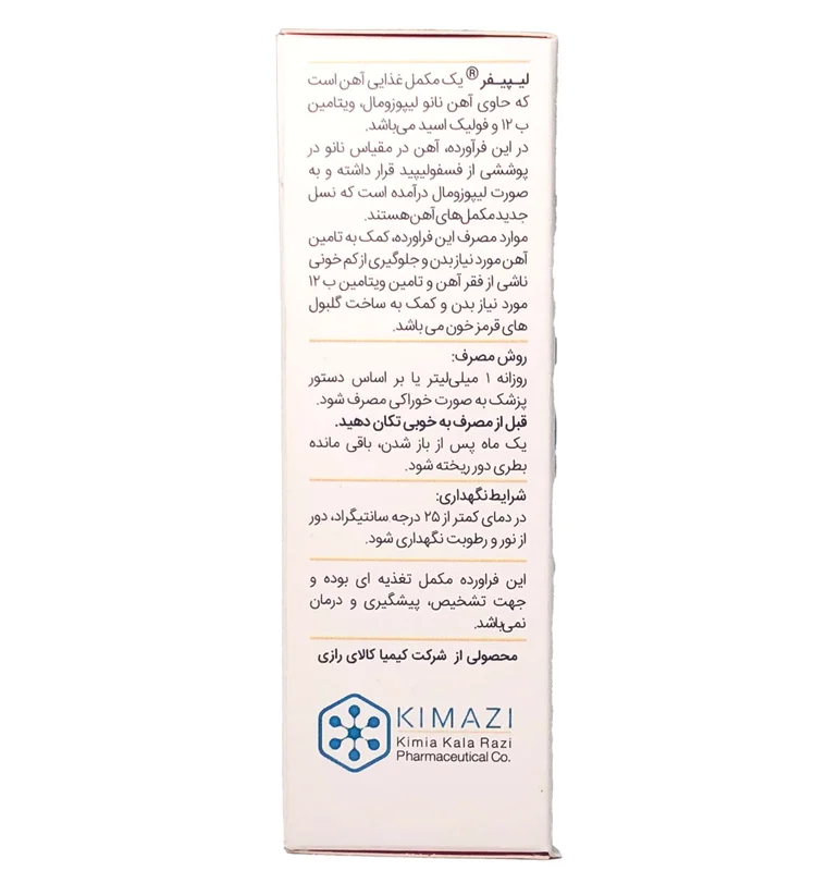قطره لیپیفر یک محصول از شرکت کیمیا کالای رازی است که حاوی آهن به فرم نانولیپوزومال به همراه B12 و فولیک اسید میباشد. قطره لیپیفر کیمیا کالای رازی به عنوان یک مکمل تغذیهای طراحی شده است با اهدافی همچون تامین آهن مورد نیاز روزانه بدن، پیشگیری از کم خونی ناشی از فقر آهن و کمک به ساخت گلبولهای قرمز.