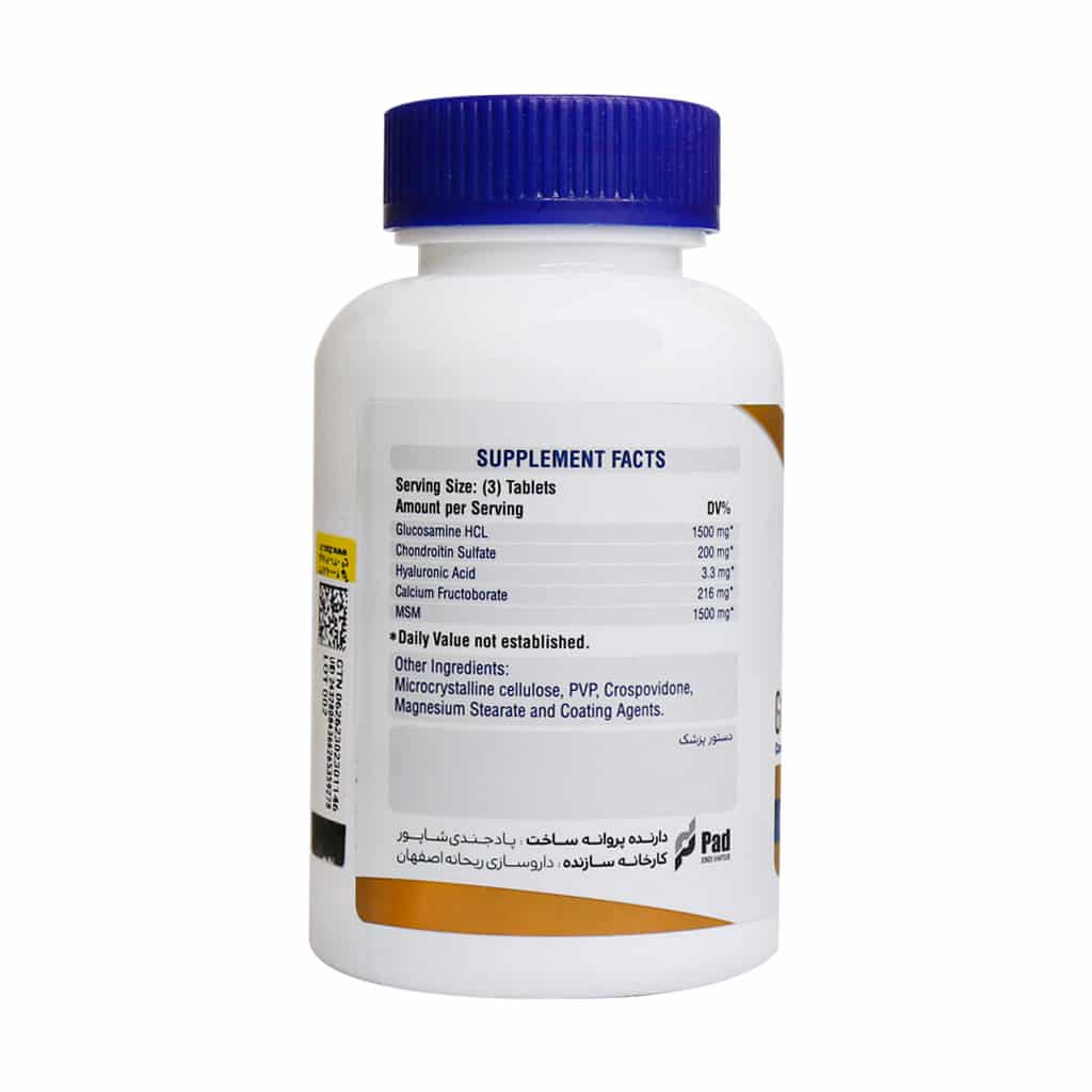 •حاوی گلوکوزامین، کنروتین سولفات، هیالورونیک اسید، کلسیم و ام اس ام