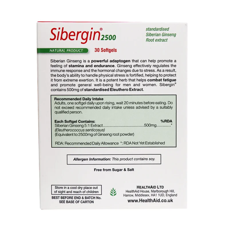 کپسول سیبرجین ۲۵۰۰ میلیگرم هلث اید از محصولات برند هلث اید میباشد که؛ حاوی معادل ۲۵۰۰ میلیگرم جینسینگ سیبری استاندارد شده است. این کپسول با خواص آنتیاکسیدانی بسیار بالا سبب افزایش سطح انرژی بدن میشود. علاوه بر آن، کپسول جینسینگ ایرانی هلث اید حاوی نیاسین، اسیدهای آمینه، کربوهیدرات و سایر ویتامینها و مواد معدنی است که برای افزایش سلامت زنان و مردان در تمامی سنین بسیار موثر عمل میکند.