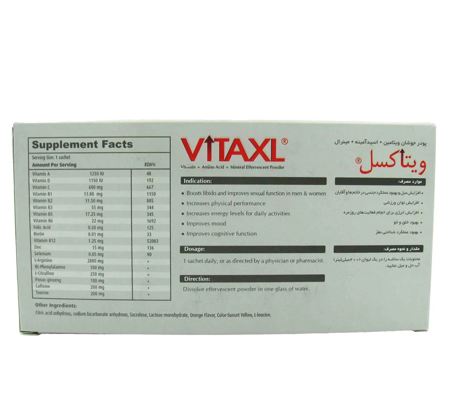 کمبود انرژی و نقص مواد مغذی میتواند تاثیرات منفی بر سطح انرژی، احساسات، و عملکرد جنسی و ذهنی داشته باشد. پودر جوشان ویتاکسل بهشاد در ویتامینها، مواد معدنی، اسیدهای آمینه، و گیاهان دارویی حاوی فرمولاسیون اختصاصی است ساشه جوشان ویتاکسل میتواند بهبود عملکرد جنسی، افزایش انرژی برای فعالیتهای روزمره، خستگی مزمن، توان ورزشی، خلق و خوبی، مقابله با استرس، و بهبود عملکرد شناختی کمک کند.