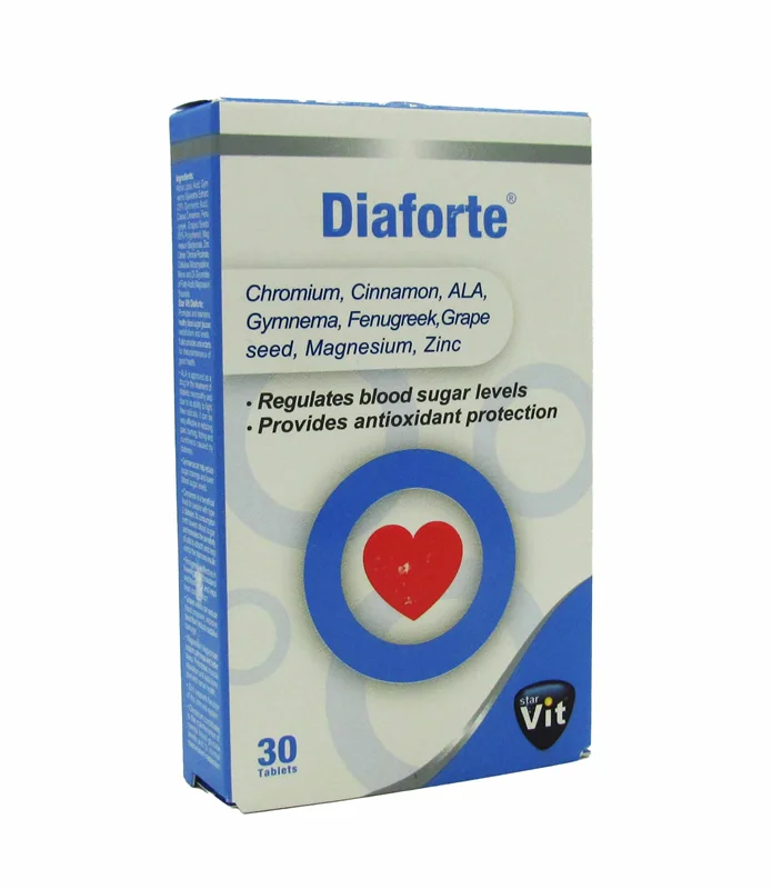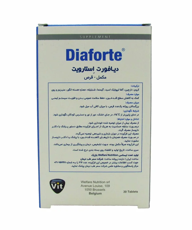 قرص دیافورت استار ویت با ترکیبات منحصر به فرد از گیمنما، دارچین، آلفا لیپوئیک اسید، شنبلیله، کروم، هسته انگور، منیزیم و زینک، به کاهش سطح قند خون در بیماران دیابتی و پیش دیابتی کمک میکند. این قرص عوارض دیابت از جمله نوروپاتی را پیشگیری کرده و بهبود زخمهای دیابتی را تسریع میکند. مصرف کروم نیز میتواند سطح قند خون را کاهش داده و پیشگیری از افزایش قند خون را انجام دهد. این مکمل میتواند بهبود میزان قند خون را تنظیم کرده و باعث بهبود عملکرد افراد شود. علاوه بر این، کمک به حفظ سلامت عمومی بدن و تقویت سیستم ایمنی فرد، و از بیماریهای مختلف جلوگیری نماید.