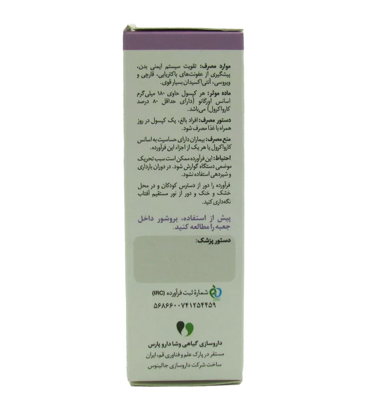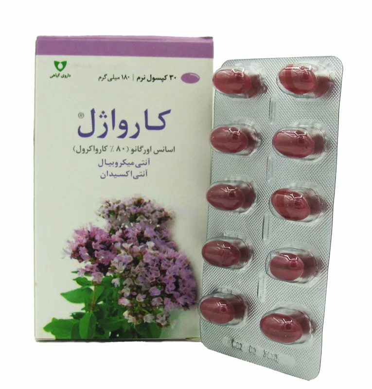 - توضیح: علاوه بر اسانس مرزنجوش و کارواکرول، کپسول نرم کارواژل ممکن است حاوی ترکیبات دیگری نیز باشد که بر اساس فرمولاسیون و مقدار دارویی محصول تعیین میشوند. این ترکیبات ممکن است شامل ویتامینها، مواد معدنی، ویتامینهای گیاهی، یا عصارههای دیگر گیاهی با خواص متنوع باشند که به تقویت سیستم ایمنی، حفظ سلامت معده و پشتیبانی از سلامتی عمومی بدن کمک میکنند.