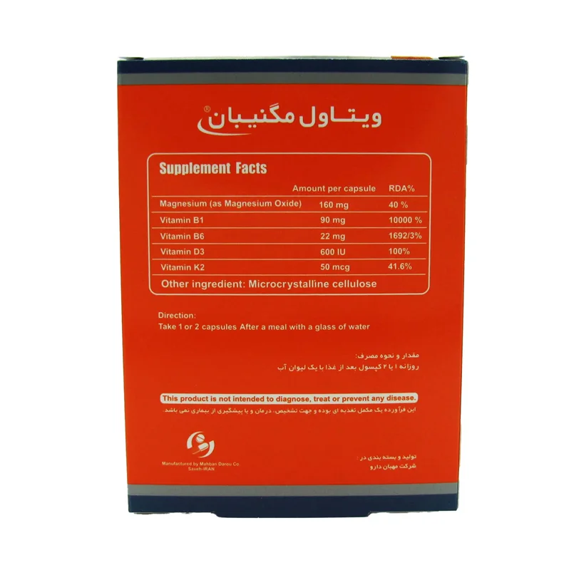 روزانه ۱ یا ۲ کپسول مگنیبان ویتاول بعد از غذا با یک لیوان آب میل شود.