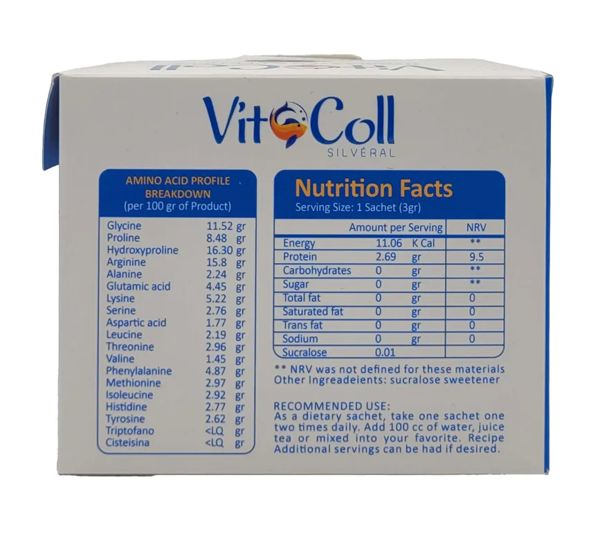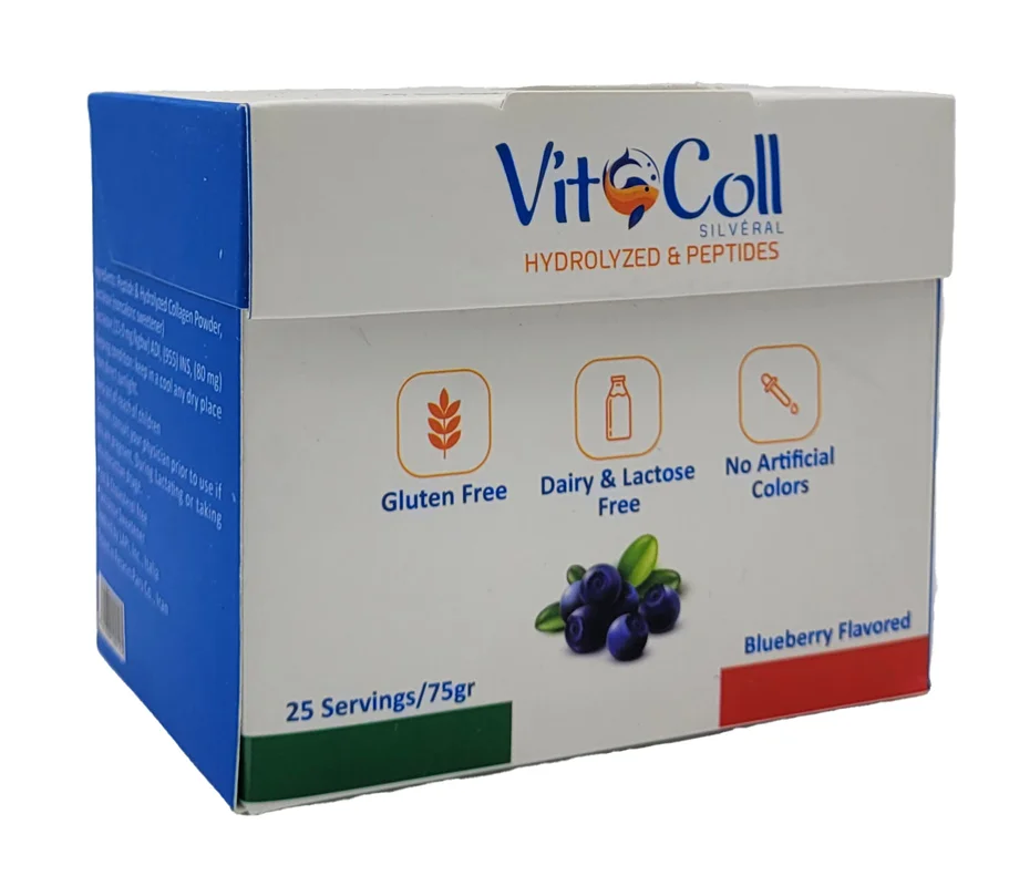 پودر کلاژن خوراکی ویتوکل حاوی ۲۵ ساشه ۷۵ گرمی از پودر کلاژن پپتید است. این محصول با داشتن ترکیبات منحصر به فردی از آمینواسیدهای ضروری برای بدن انسان و مقادیر قابل توجهی از هیدروکسی پرولین و گلایسین، نقش مهمی در سلامت پوست و مفاصل دارد. طعم خوب پودر کلاژن خوراکی ویتوکل باعث شده است که افراد آن را به راحتی مصرف کنند. از دیگر ویژگیهای پودر کلاژن خوراکی ویتوکل این است که شیرینکننده سوکرالوز دارد و برای افراد دیابتی نیز مناسب است.